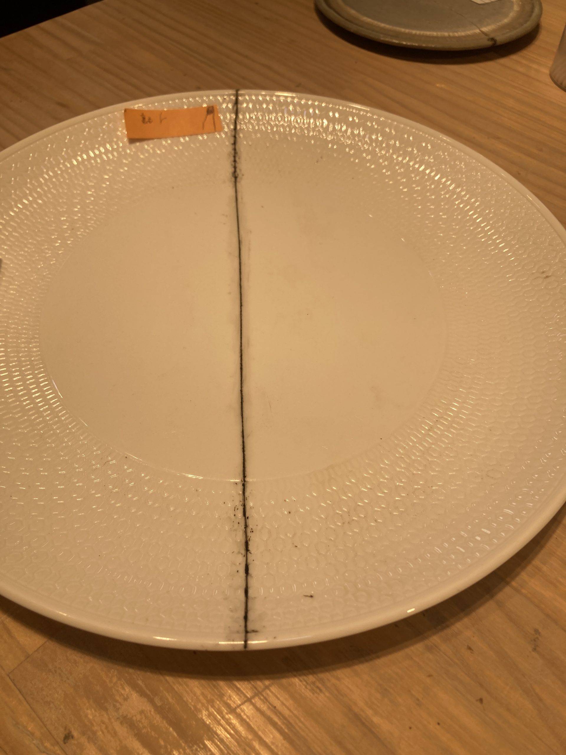 ウェッジウッドの30センチほどある大皿が、きれいに真っ二つ!